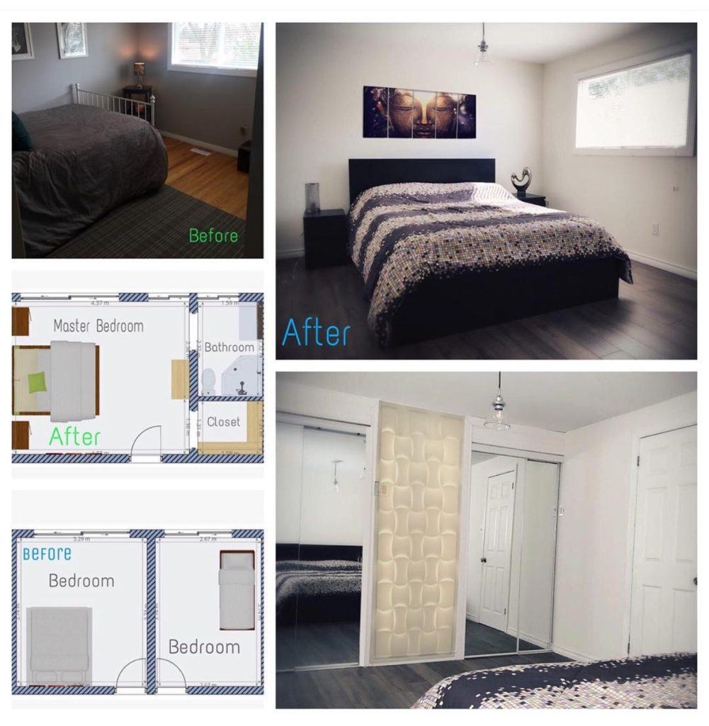 a spacious and functional master suite that now includes a large sleeping area, a dedicated walk-in closet, and a private bathroom.